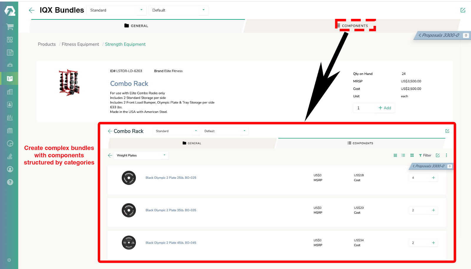 IQX’s relational product tree helps ensure accurate and valid product bundles by defining component and cost dependencies (e.g., required, excluded, recommended). This eliminates configuration errors, streamlines the quoting process, and enables effective cross-selling/upselling. The image shows an example being used by a fitness equipment manufacturer.